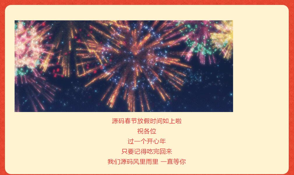 在2021年春節(jié)來(lái)臨之際,源碼祝愿廣大客戶:幸福安康,生意興隆,事業(yè)有成,牛氣沖天,根據(jù)《國(guó)務(wù)院辦公廳公布2021年春節(jié)放假安排》,結(jié)合公司實(shí)際情況與工作安排,春節(jié)放假安排如下: